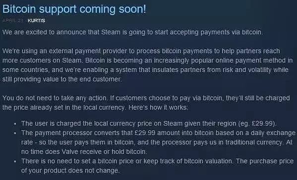 - 支付处理商会将这29.99英镑,根据每日交易所汇率兑换成等值的比特币,因此,用户使用比特币进行支付,但支付处理商支付给Steam的仍然是传统货币。Valve公司(Steam运营商)不会收到也不会持有比特币。