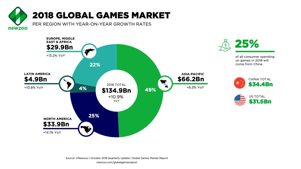 很简单,我们来看看游戏市场,去年大约1349亿美元,中国用户贡献344亿美元。