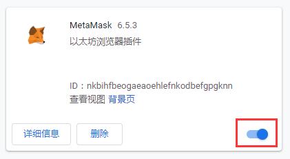 点击扩展程序后就会在页面中显示你Chrome上安装的扩展程序菜单,在其中找到MetaMask关闭右下角的开关,就可以停用MetaMask了。(下图所显示的是开启的状态)