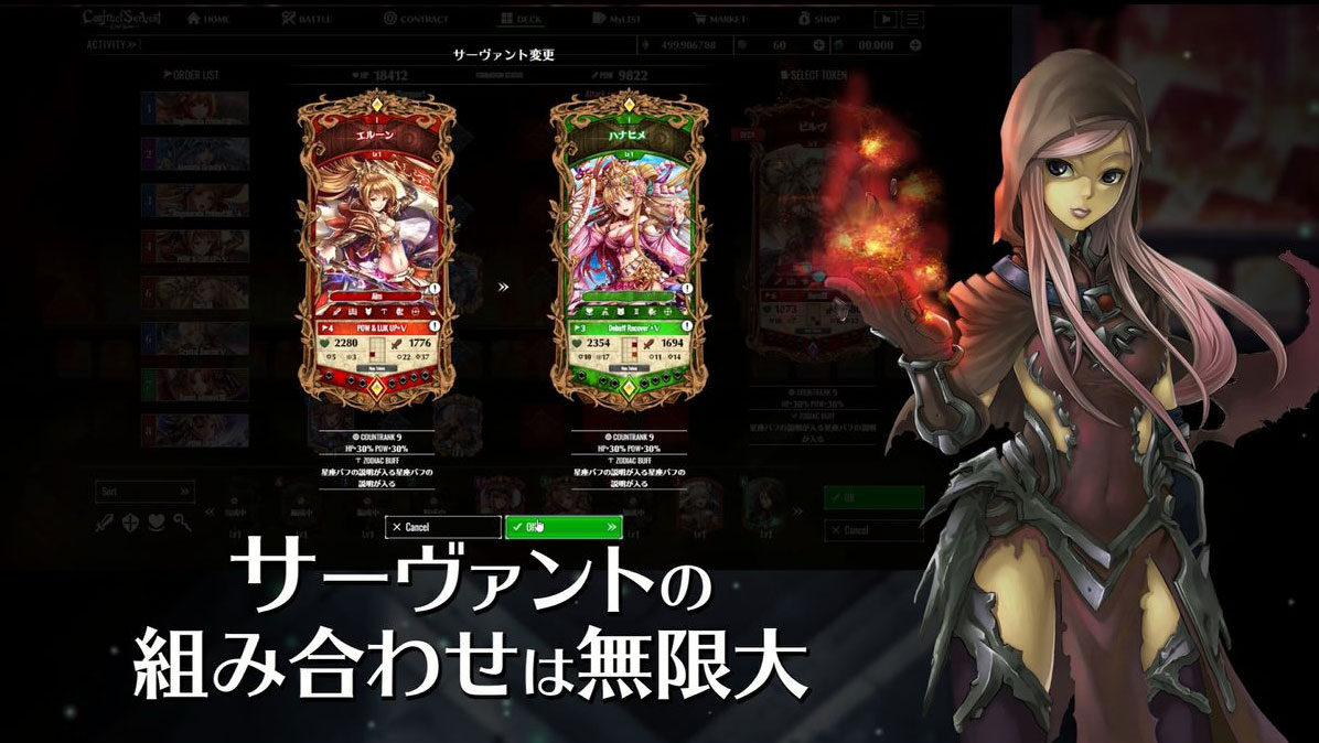 其组合有超过1兆2554亿以上!理解每个从者(卡牌)所持的性质,选择合适的卡牌放入卡组,是一款玩家的命令将在很大程度上影响胜败的、战略性很高的卡牌游戏。