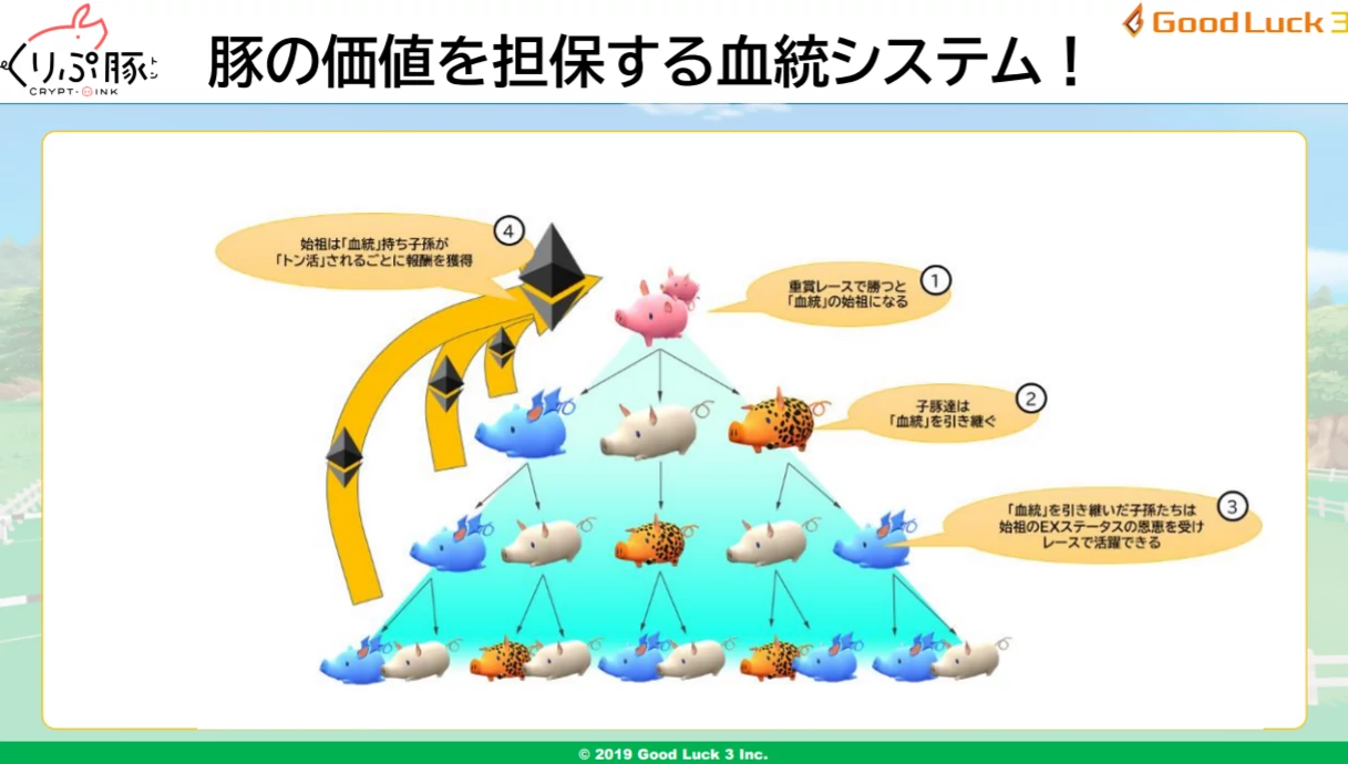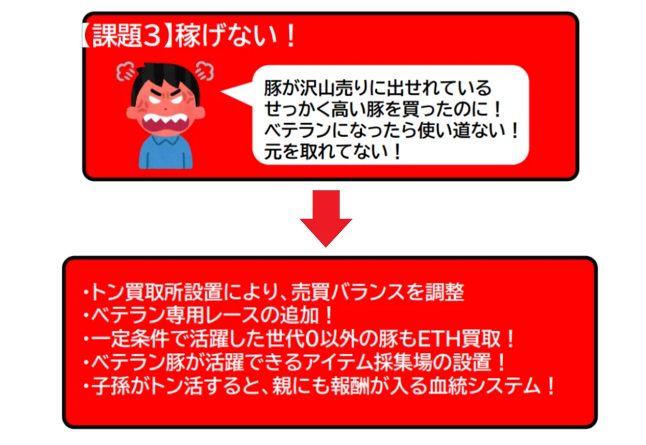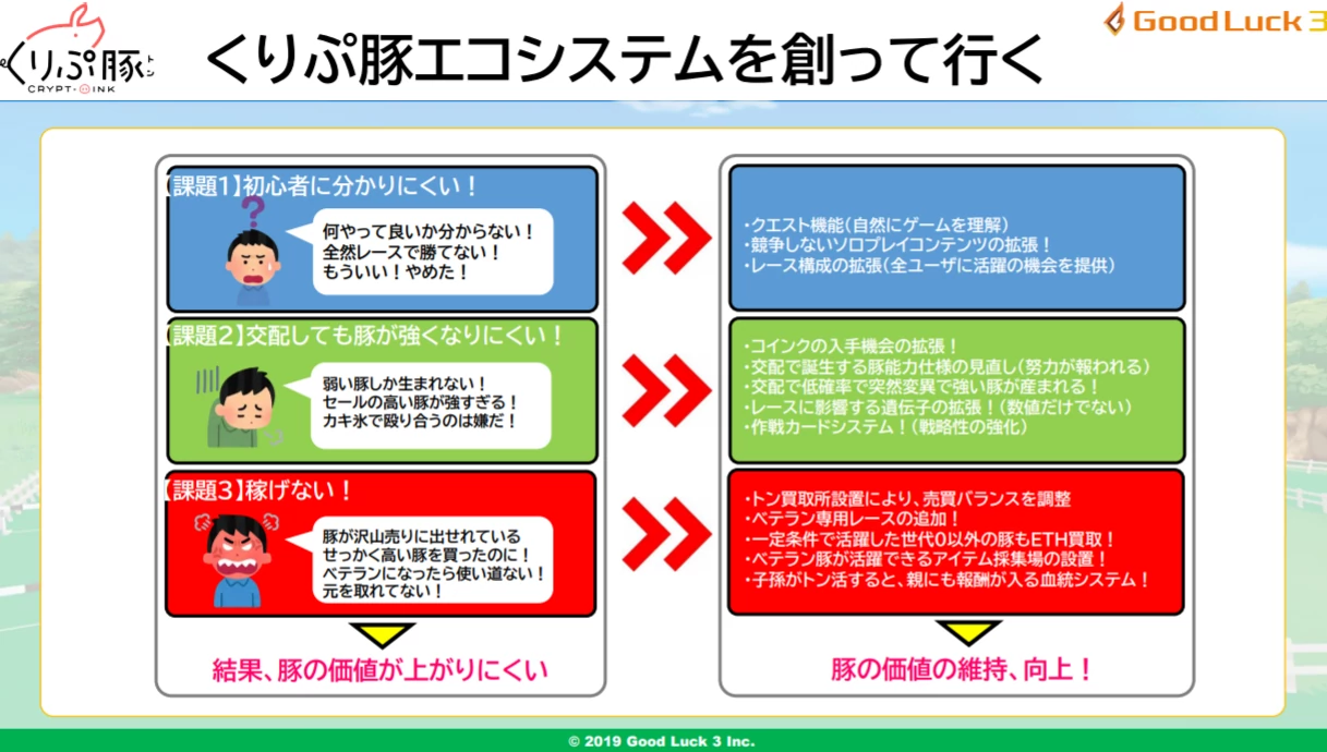 构造不会成为Pay to Win的游戏性质。制作谁都可以入手高价值的猪,创造游戏中容易活跃、买卖的环境。