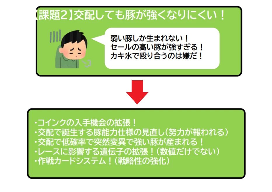 但是今后将会增强基因对除了数值以外的部分的影响,因此将不会废掉活跃中的猪,还可以将能力继承到现在的猪之上。