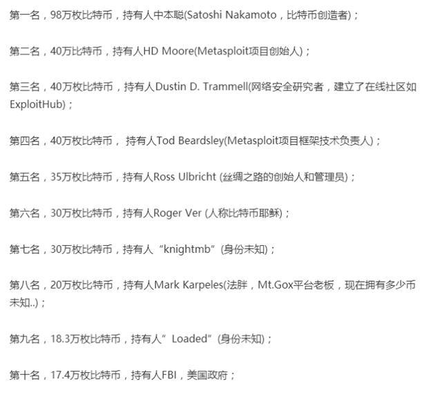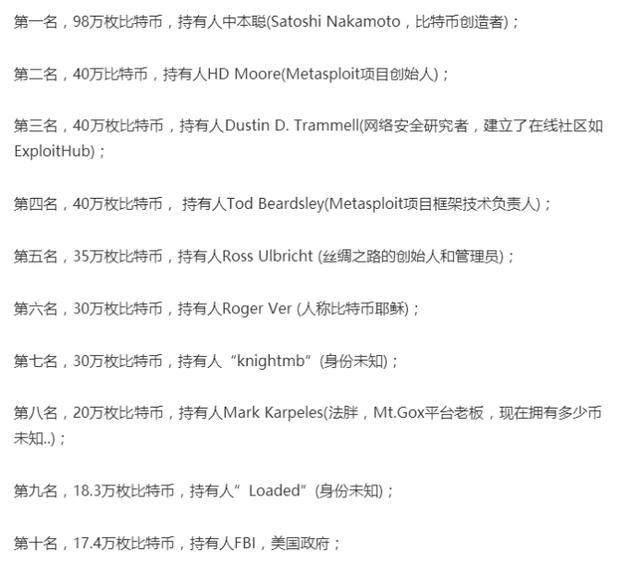吴宗宪说他有120个,李笑来有十几万个,蔡文胜有1万,吴霸有几十万个起步,再加上徐明星,李林,赵长鹏的比特币,还有锁定的门头沟被盗的85万个比特币,一共挖出来1700万个,门头沟理赔就有十几万个,丢失的就有几百万个,最后再加上知乎几百个万币候,还有网上盛传的比特币持有榜: