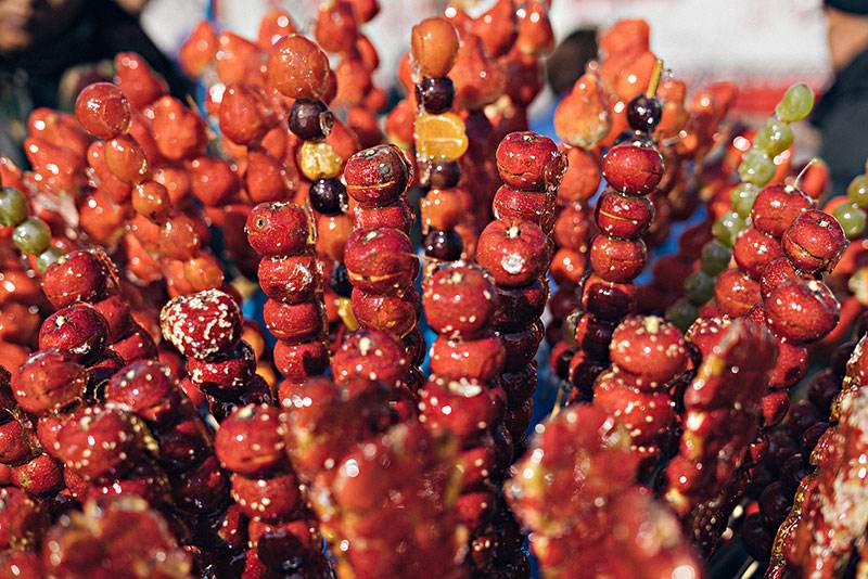 比如说“冰糖葫芦”。冰糖葫芦的历史从宋朝就开始了,在清朝各地开始盛行,尤其是在茶楼、戏院和大街小巷里,这应该算是行走在街上的民间小吃!