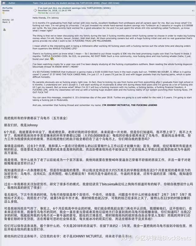 无独有偶,前段时间,一个名叫 TurtleCoin 乌龟币(我更愿意叫他龟龟币,显得比较可爱)的项目在国外也火了,起因是一个国外的高中生在 Bitcointalk 论坛发表了一个名为《我把我全部的学费都买了龟龟币》的帖子。
