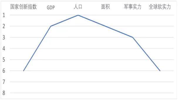 将上面8个国家综合国力组成的各项指标进行排序,中国人口世界第一,经济总量世界第二,国土面积世界第三,军事实力世界第三;国家创新指数第17位,全球软实力第27位。这些数据形象反映中国综合国力的总体情况,会形成一张倒U型的图。与产业经济的“微笑曲线”对应,我们把它称之为综合国力的“哭泣曲线”。