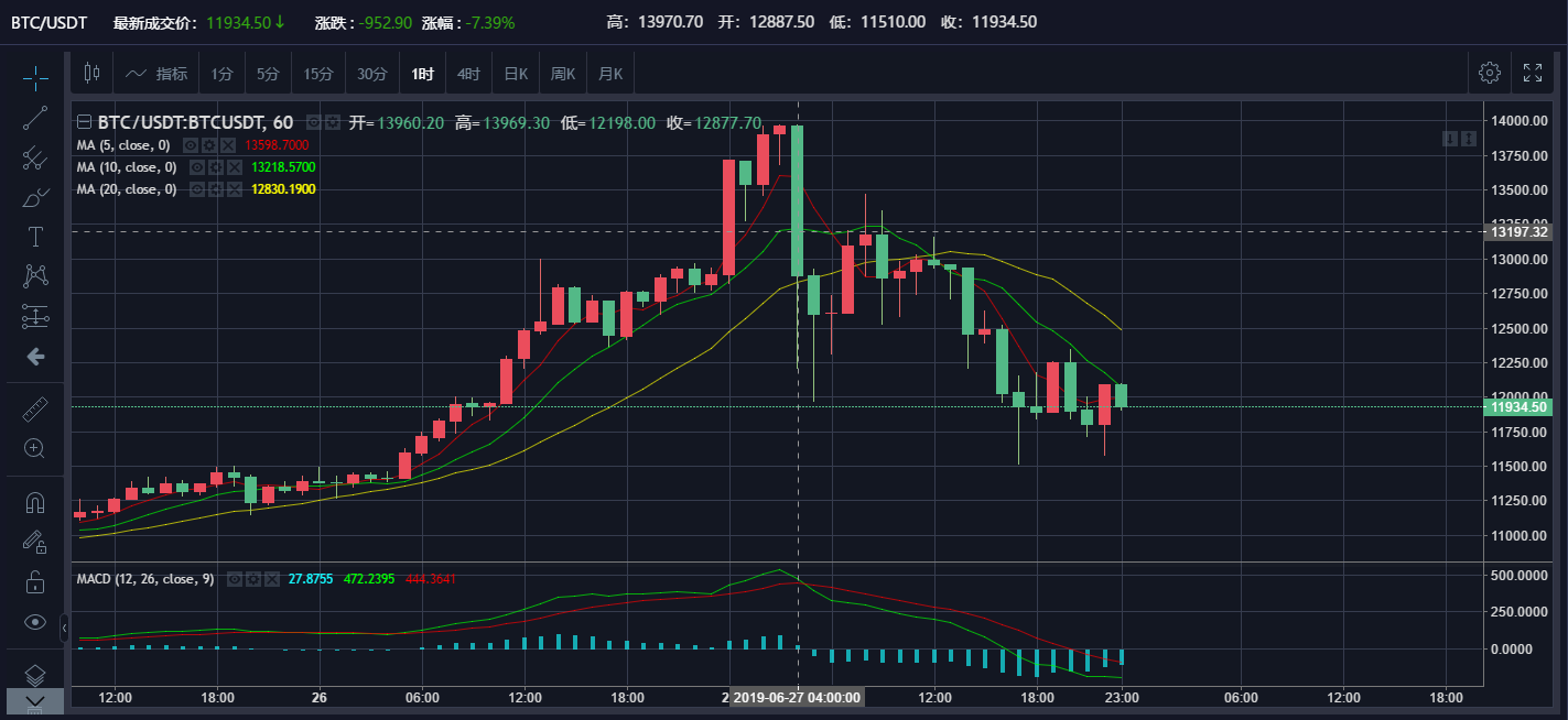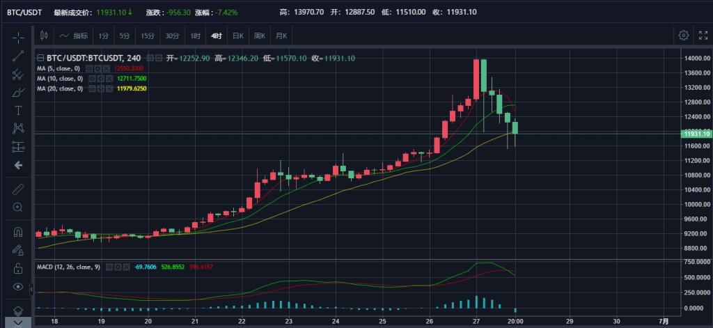 幣圈古靈: 13000這位置成了多空交戰的主戰場,多空交戰不要緊,但傷及無辜就不好了,主流幣被比特幣吸的體無完膚,等待主流補漲的投資者今天全都吃了面,這種走勢讓人始料未及,BTC先回踩12400附近,然後上攻13500週線阻力位,同時也是從歷史頂部到3150底部的61.8%斐波那契回撤線。但後半部分就比較戲劇化了,BTC加速上漲,一度越過了該強阻力位,觸碰到14000整數位,引爆了市場信心,營造了一波假突破的誘多行情,然後拐頭往下,最低插針到11800。在此巨幅波動中,除了ETH相對穩定之外,其它主流幣幾乎全線破位暴跌。
