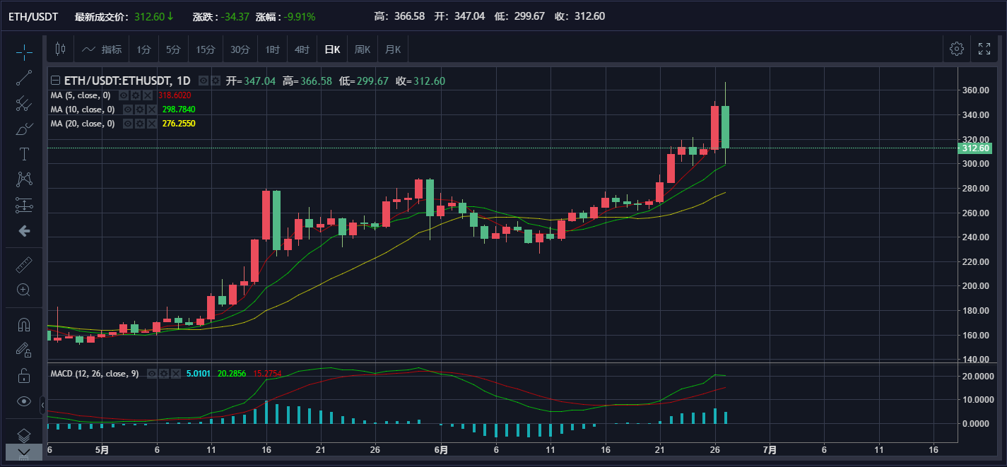 主流幣普遍血流成河,eth還在堅守,回調過後如果趨勢沒變,仍然要把eth作為重點關注的對象,壓力位350,支撐位315。