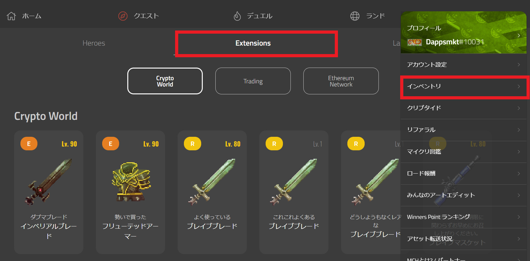 点击右上角的 Ξ 选择“イベントリ”,切换到Extension界面。
