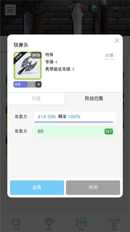 1级的不用说了,标了3EOS,这里有个绿色闪光的进度条,这意味着可以升级,也就说这件1级的斧头最少有2件,最多16件。我们点开看到是这样的: