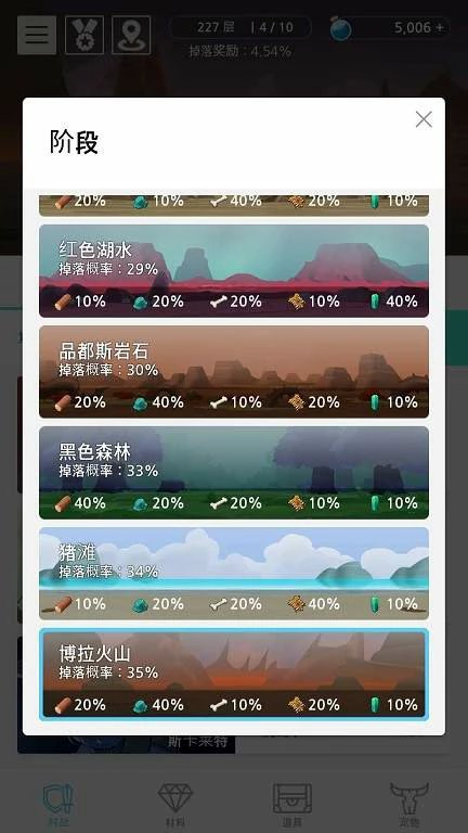 材料界面有材料图鉴可以查看,目前分成了自然、金属、骨骼、皮和矿物5大类,各5个等级( 11种),共55种。