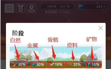 地图上的数字是这个地图出产这5种材料的概率比例。