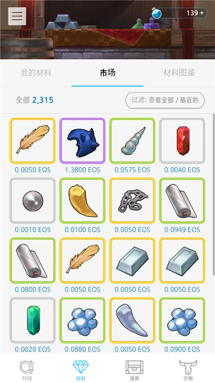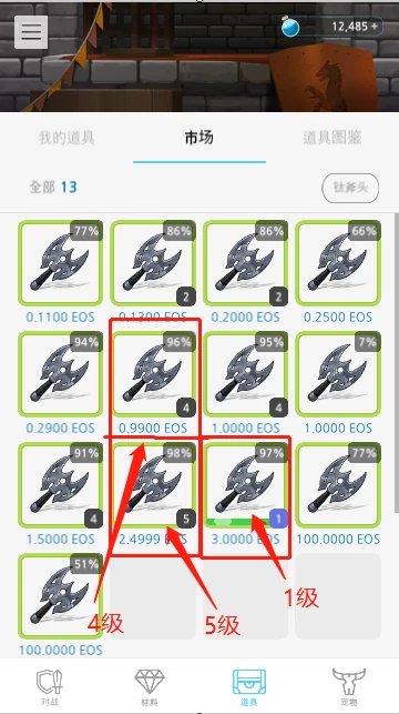 最低价目前分别限制为:4种中等(灰色框)> 0.001EOS;3种稀有(橙色框)> 0.005EOS;2种特殊(绿色框) )> 0.01EOS;1种传奇(紫色框)> 0.05EOS;1种远古(红色框)(问了几位玩家,应该是> 1EOS)