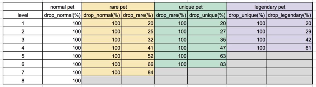 设材料存在的概率为P,杀死宠物获得材料数量为Q,则,同等级材料数量为S: