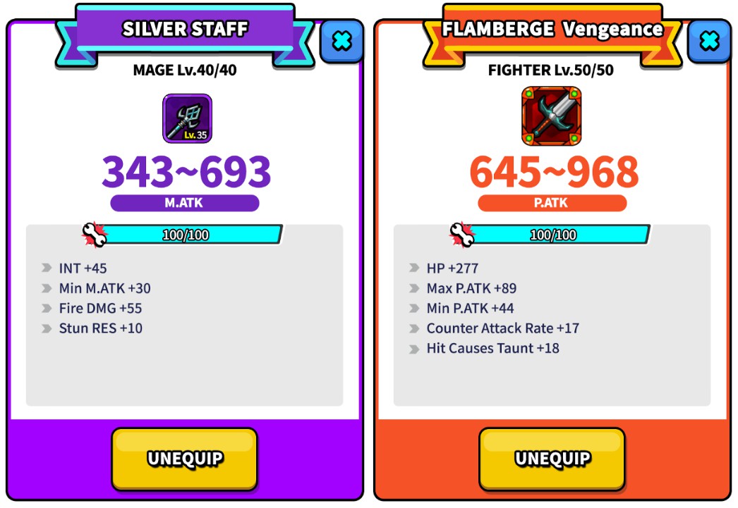 你初始获得的装备为1级。1级装备威力较小且不支持选项。你可以将装备最高升级到50级,具体取决于你的装备稀有度。升级后,你的装备性能会更好,你可以随时解锁选项。你还可以选择使用额外的装备或石头来升级你的装备级别。