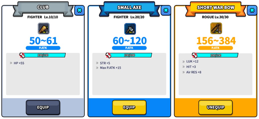 每个等级可用的武器不同,当前等级的英雄不能使用其它等级的武器。请谨慎选择,因为同一等级分组中武器的攻击力根据武器和特性而有所不同。