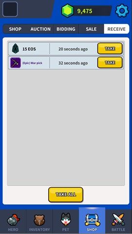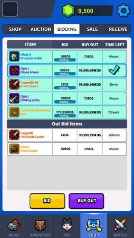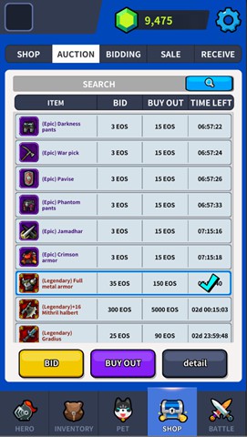 如果您足够幸运地获得了传奇装备,您可以在市场上以最高价格进行拍卖。在玩游戏的同时赚取EOS !!
