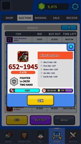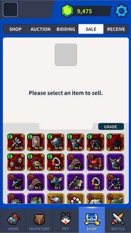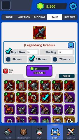 在下面的截图中,您会发现在可爱的宠物(BET)和战斗(BATTLE)图标之间插入了“商店(SHOP)”图标。进入市场后,您将能够浏览目前市场上待售的所有商品。它们将按拍卖到期剩余时间进行排序,即将结束拍卖的商品排在最上面。