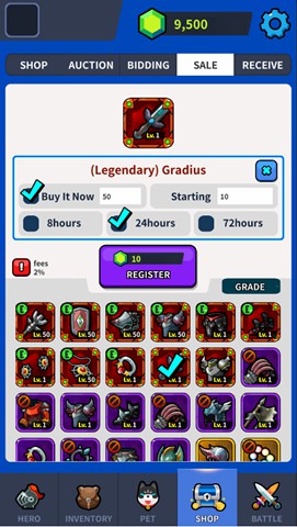 在“加密剑与魔法”世界里,您可以随时打开拍卖市场。 您还可以在市场中出售您的装备,这样可以最大化您在游戏中资产的价值。