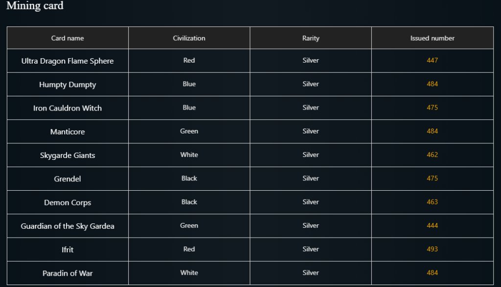 然而,通过采矿来获得的卡牌只有白银和青铜。而只有白银以上珍稀度的卡牌才可以换成NFT。在采矿栏下可以查看所有能够获得的卡牌类型。