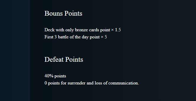 使用特定类型的牌组越少,而玩家选择了此种牌组并获胜,则给出的分数越高。因此,举个例子,如果我选择白牌并赢得战斗,我将获得88分。如果是在一天的前3场战斗中,我同时使用了所有的铜牌,那么总积分将是88*1.5*5,即660分。如果我输了,我将得到40%,这仍然是264分的巨大数字。