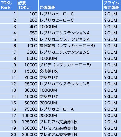 在本赛季中,设定了对应TOKU数量的TOKU Rank。当完成Rank所需TOKU数时,就可以获得共同奖励。