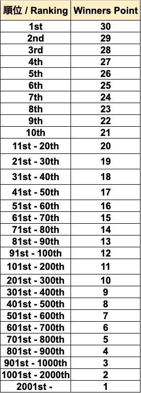 这个点数可以跨赛持有,直到2019年末为止,参加大赛的时候获得的点数会增加。(获得点数奖会在2019年末重置)
