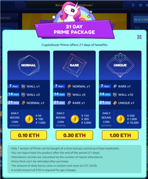 玩家在进入游戏后,能在“My Page”页面“我的帐号”下看到这个选项。CryptoDozer Prime是《CryptoDozer》的全新奖励系统,会给玩家发放每日奖励以及每周特别奖,你需要每天签到来获得第21天的终极大奖,玩家还能在这里拿到超稀有的Gold CryptoDolls。