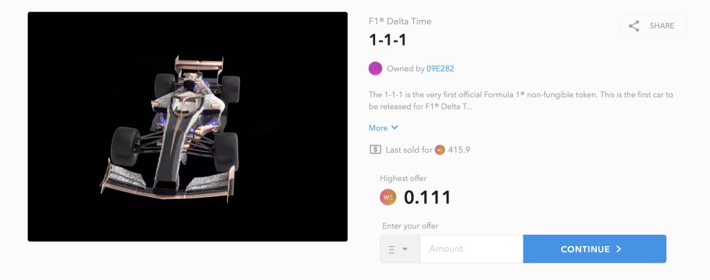 数字资产市场上确实有琳琅满目的部件供玩家选择,在此同时,玩家也能看到之前拍卖的三部赛车,其中有价值415ETH的首款虚拟F1赛车1-1-1,以及摩纳哥版和法国版。