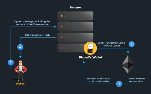 其次,SAND币也执行目前还是草案的EIP1776协议,这一协议是开发团队提出来实现本地超交易标准化,能让使用EOA钱包(例如Metamask)的用户在未持有ETH的情况下进行交易。
