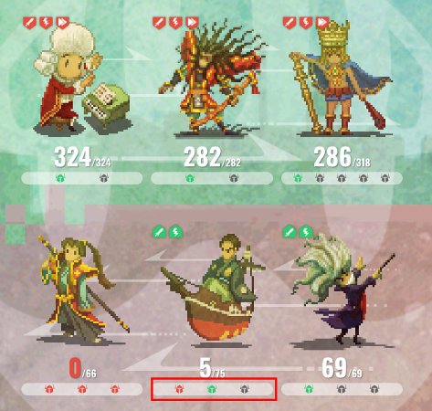 在战斗中,每个位置的成员状态与对手都会显示在HP的下方。