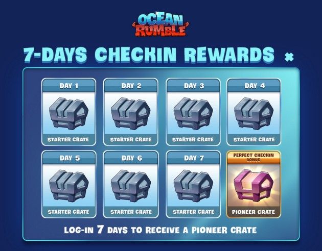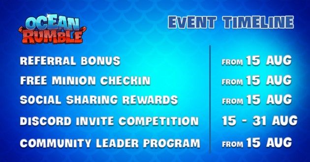 开发团队开启了一个推特分享活动,只要有推特和脸书帐号就可以参与,开发团队会抽取幸运玩家发放宝箱。分享内容可以是跟游戏有关的一切东西,记得加上标签#OceanRumble,开发团队也会根据内容的创意来考虑奖项。