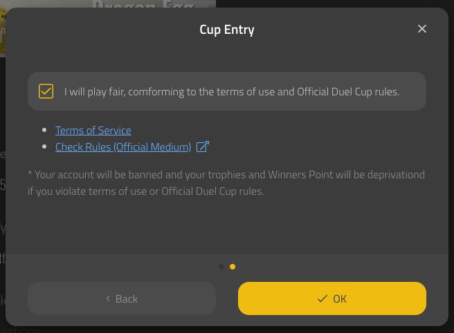 英雄选择后,勾选请阅读并同意使用条款点下【OK】按钮。决斗杯的报名参赛就完成了。一旦报名了其中一场决斗杯,就不能参加同时举行的其他决斗杯了。