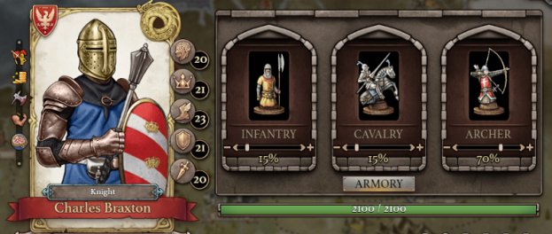 玩家现在可以选择如何调配步兵、骑兵、弓兵三个兵种的比例,兵力配比将会影响战斗的结果,因此用军队设置多试验不同的组合总是有好处的。开发团队也将引入武器库系统,玩家可以用额外道具升级军队,装备能在战斗中提供额外增益的技能。