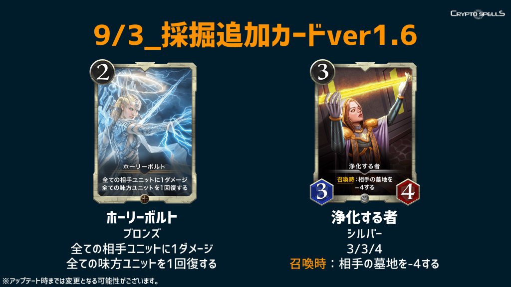 新的一月区块链卡牌游戏《CryptoSpells》又迎来了新的更新,卡牌上新和功能改善肯定也是必不可少的内容之一了。与此同时,上回的排名赛β也迎来决赛结果。就让我们一起来看一下吧!