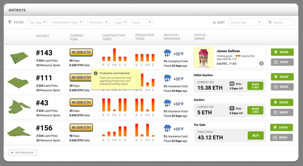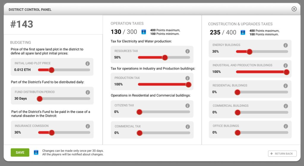 District Owner每隔30天才能调整District's Taxes。每次调整都会通过浏览器消息、Telegram和Discord渠道、去中心化城市报纸MCP Times告知玩家。