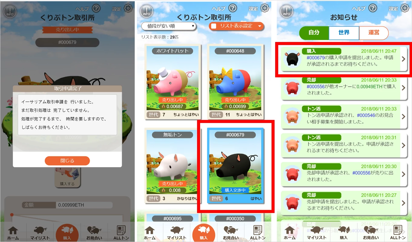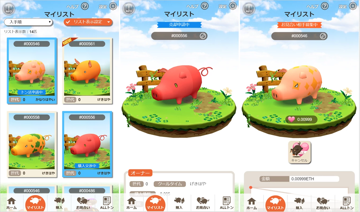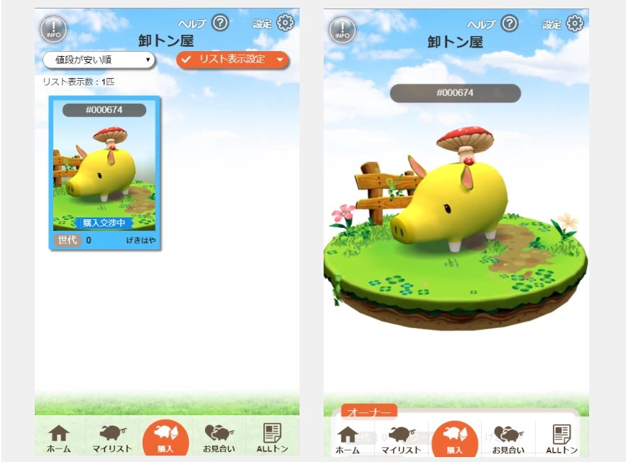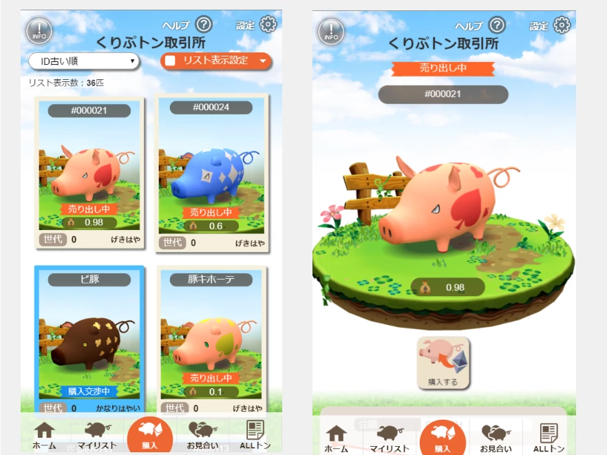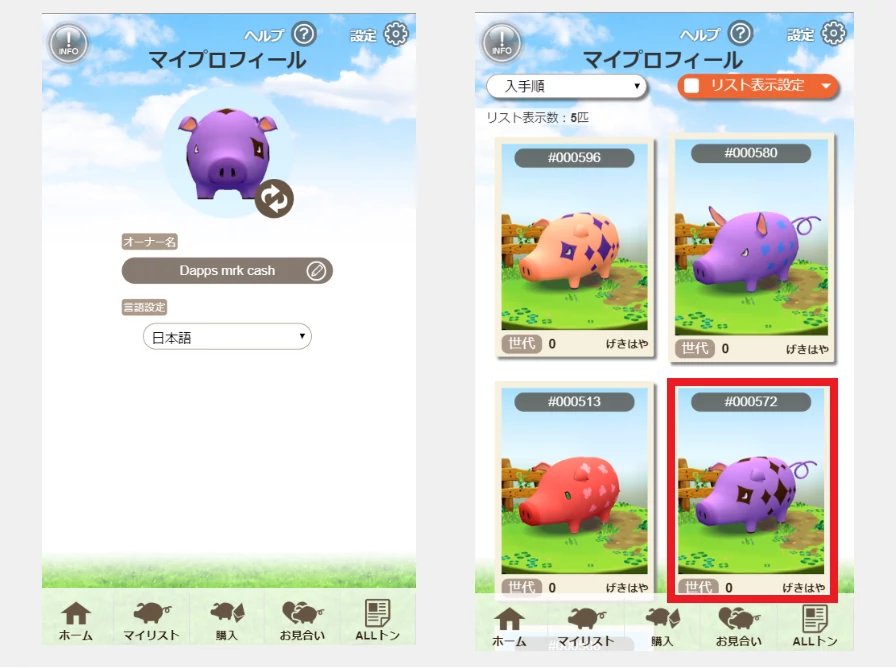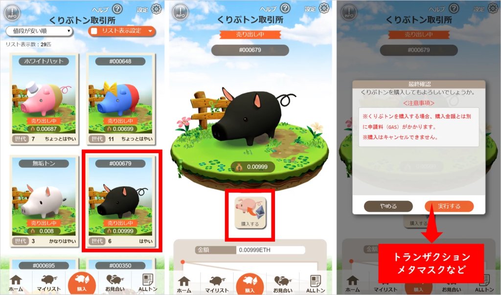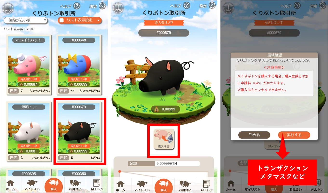 小猪的购买方法在出售屋和交易所是相同的。首先选择想买的小猪。点击“購入する”(购买)就会进入确认页面。接下来会进入钱包支付软件,之后进行数据处理。
