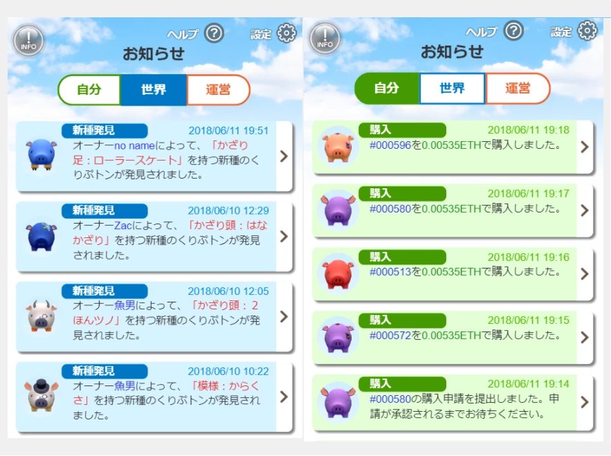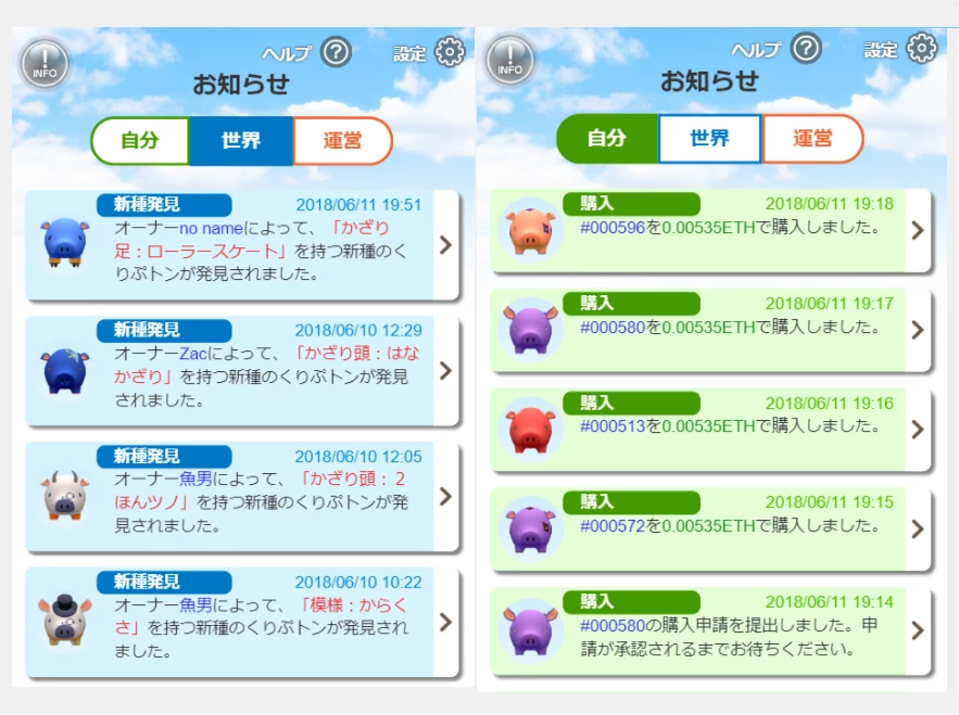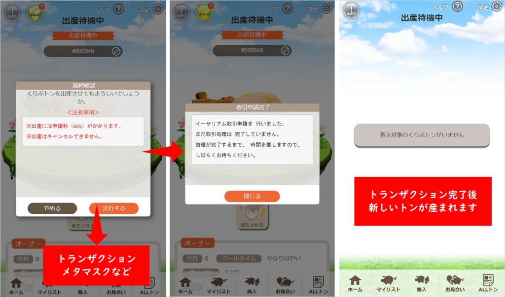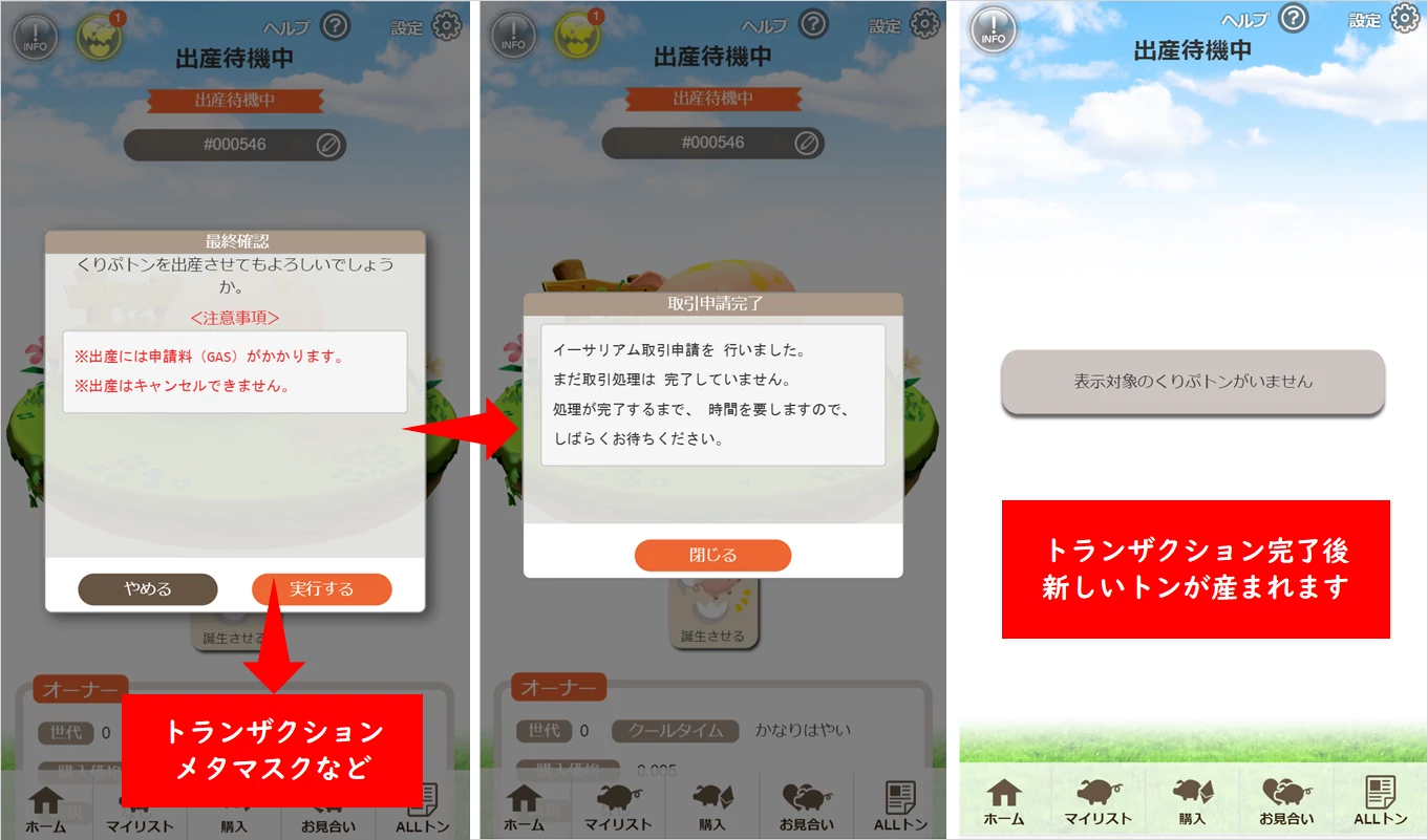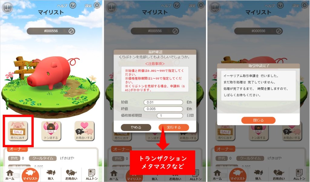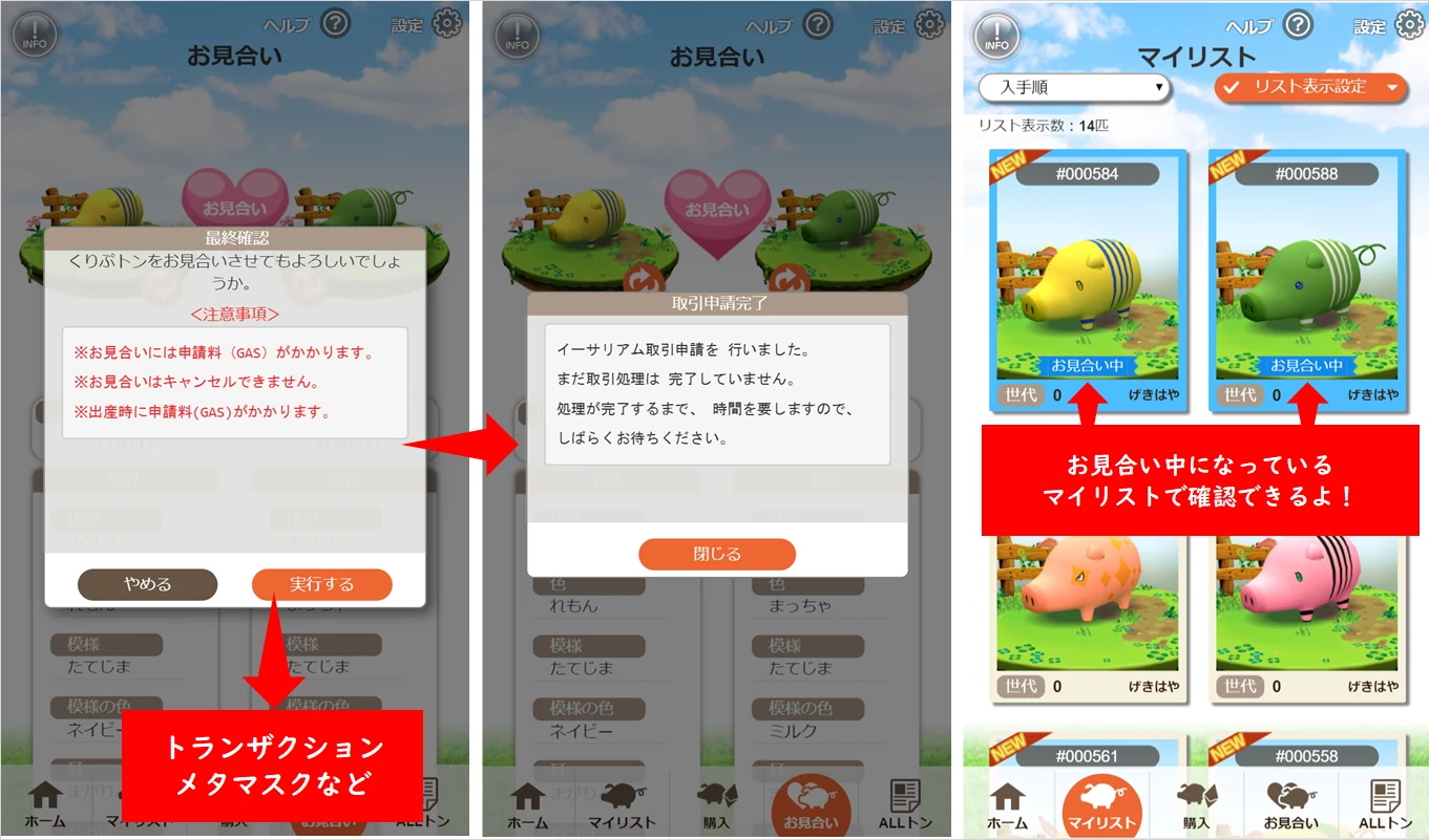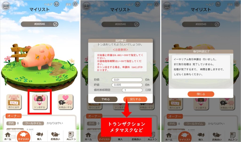 小猪的购买方法在出售屋和交易所是相同的。首先选择想买的小猪。点击“購入する”(购买)就会进入确认页面。接下来会进入钱包支付软件,之后进行数据处理。