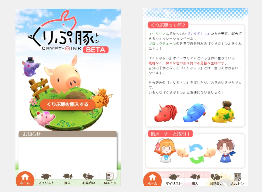 《Crypt-Oink》是一款将买入的小猪育成、交配的养成模拟游戏。理论上诞生的小猪种类有3京6000兆种,即使养成了模样也是各种各样的。值得期待的是,根据日后的更新,正在计划小游戏等事宜。