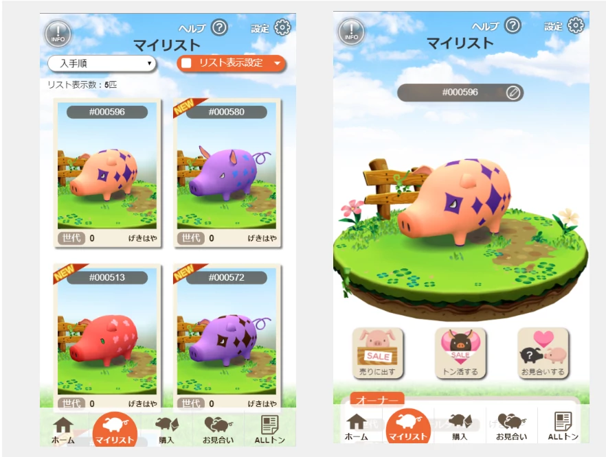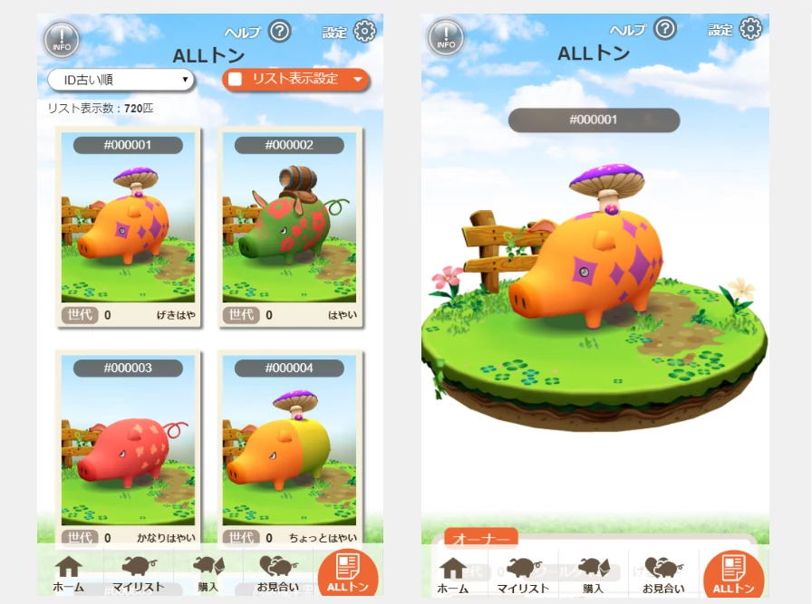 在这里玩家可以看到所有生产的小猪。如果从目录中选择的话,可以知道更详细的小猪的身份和外观。