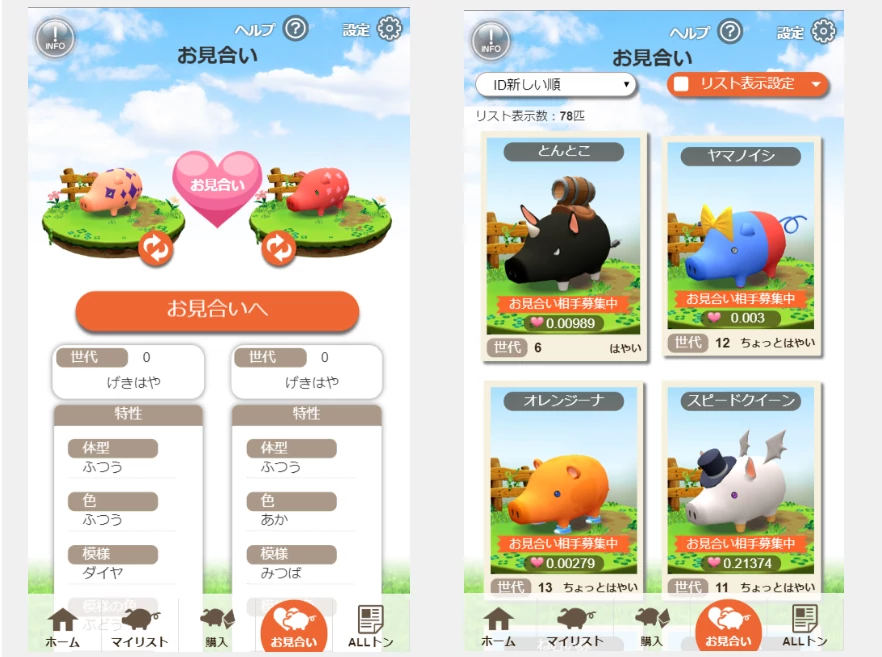 点击小猪,就可以进行出售,让小猪交配,看到更加详细的小猪信息。另外,在详情中会显示小猪的速度、力量和体力。这对以后的小游戏是有用的哦。收集各种各样的小猪似乎是更有利的呢。