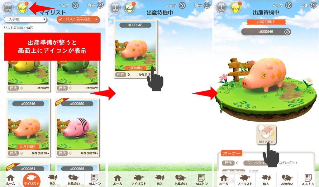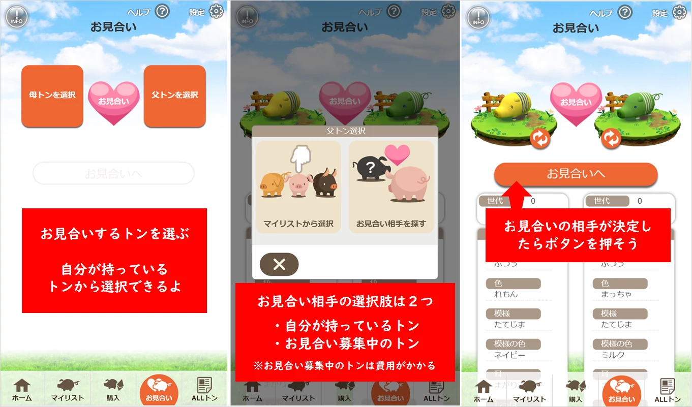 选择小猪之后,点击去交配的按钮就可以了。在交配时,可以在目录中确认正在交配的小猪。不安的时候也可以确认一下。