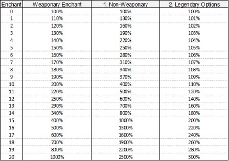 例如,将“帝王齿轮(emperor gear)”的生命值从+10%附魔到+15%时,其基本能力提升的同时,传说级属性也会提升,所以该道具将拥有+20%生命值的效果增益。