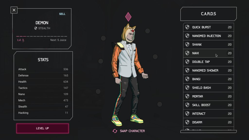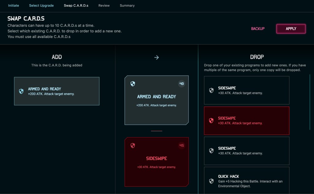 虽然角色和装备不断升级,但力量并不呈现线性增长,因为角色和装备会衍生出新的推进范畴。简单来说,玩家在升级角色和装备时,将面临3个推进选项,可以选择以C.A.R.D.S形式升级角色、装备牌组或加成额外属性。每升1级都会面临这3个选项,这就意味着从1级升到15级的过程中有数百万组合形式。目前,升级系统已经开放,玩家能够将装备从1级升到5级。