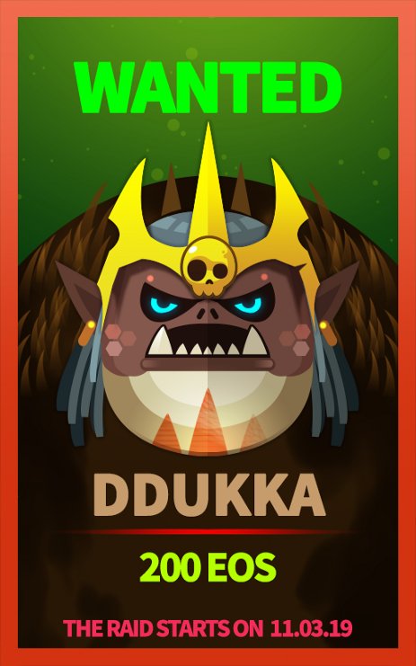 但最近,中部平原频频发生地震。人类屋猜测,或许是封禁力量削弱了,Ddukka可能要破除封印出来作妖了。为此,人类屋悬赏200EOS代币,集结各路英雄,于11月3日组团讨伐Ddukka。