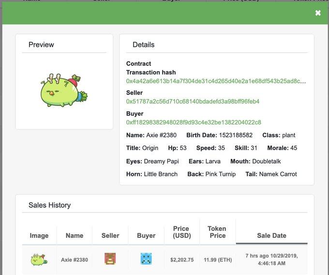虽然转手的时候卖出了高价,但Sandy并不是转手价最高的Axie。7个月前,Axie #1733卖到了110ETH(约15000美元)。8个月前,一只Axie以11000美元转手。而1年前,同样有只Axie以10000美元易主。