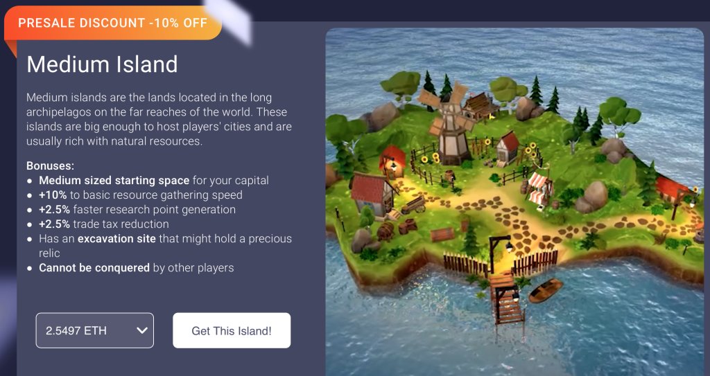 宠物养成区块链游戏《Blockchain Cuties Universe(区块链萌宠)》土地预售进入第四阶段,购买大中小型岛屿享9折优惠。