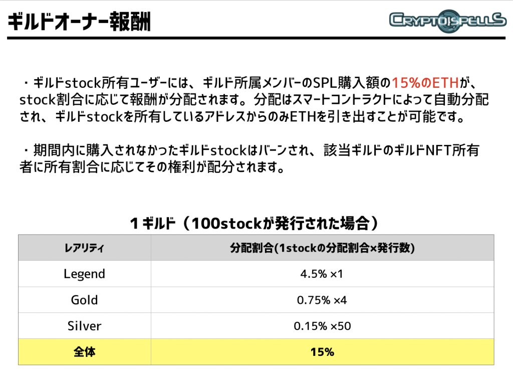 公会股票的持有用户,根据股票持有比率分配公会所属成员SPL购买额的15%ETH。通过智能合同自动分配,可以从公会股票所属地址中提现ETH。