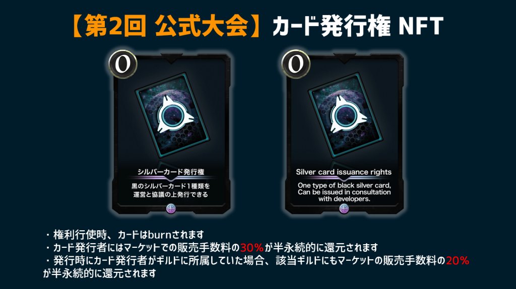 (4)提案的白银卡牌每次在游戏内市场被出售时,将会获得买卖手续费的30%到账户里。发行时所属的公会也将获得手续费的20%。移动到其他公会时,仍为发行时所属公会获得手续费。