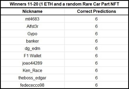 参与预测10辆赛车成交顺序的获胜名单已经公布,榜首获奖者猜对了8辆赛车的售出顺序。